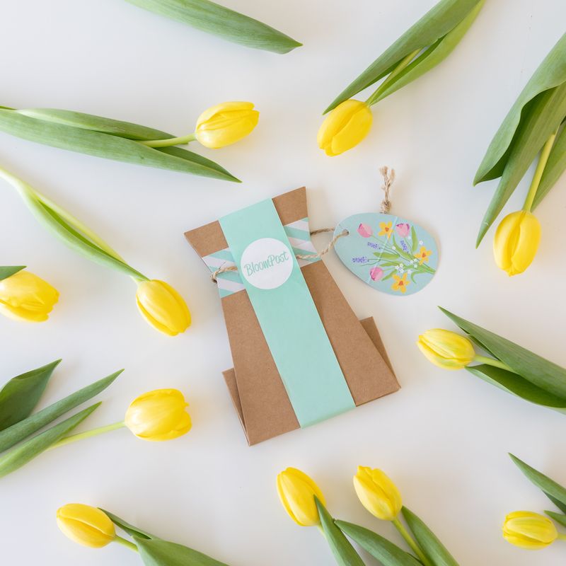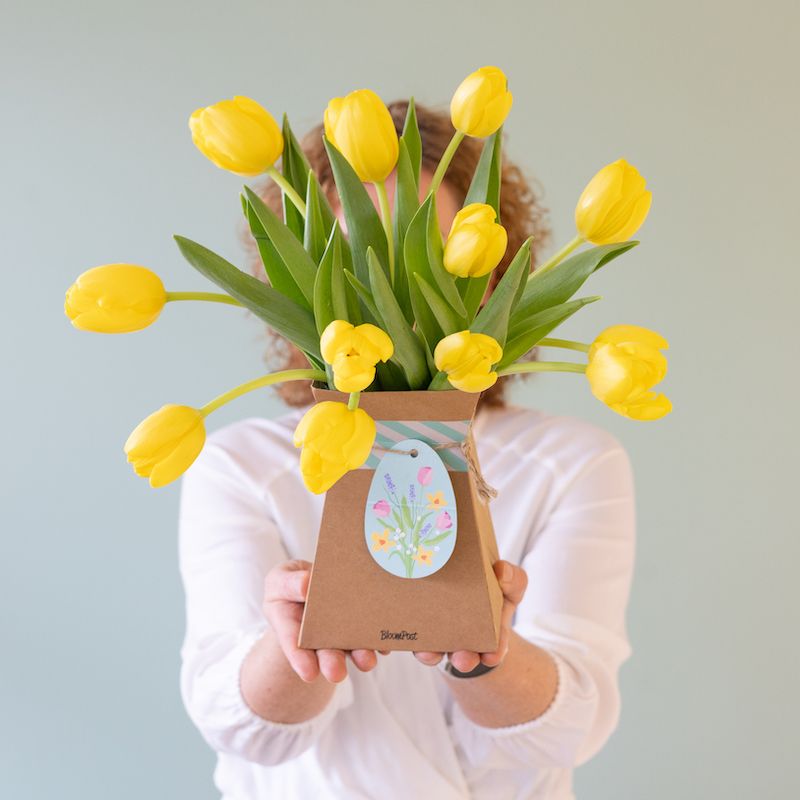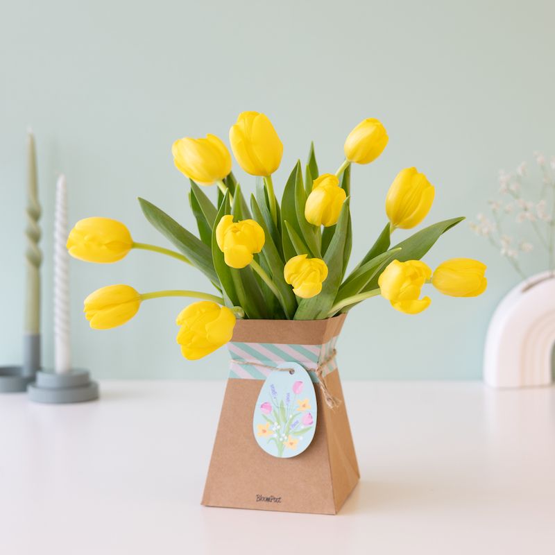 Ønsk nogen en rigtig glædelig påske med denne festlige påskebuket. Gule tulipaner står for glæde og lykke. Hvem vil du ønske en god påske til i år? Overrask dem med en smuk buket tulipaner direkte i postkassen! Modtageren kan lægge de friske blomster direkte i vores vandtætte foldevase. Gør din gave ekstra personlig ved at tilføje et flot påskekort.